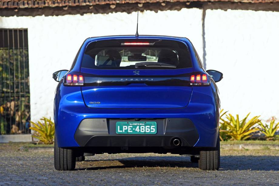 A traseira se inspirou nos 3008 e 5008, e tem uma barra preta interligando as lanternas, que estão bem mais compactas. Mas elas não têm leds em nenhuma das versões, embora os efeitos simulem isso bem.