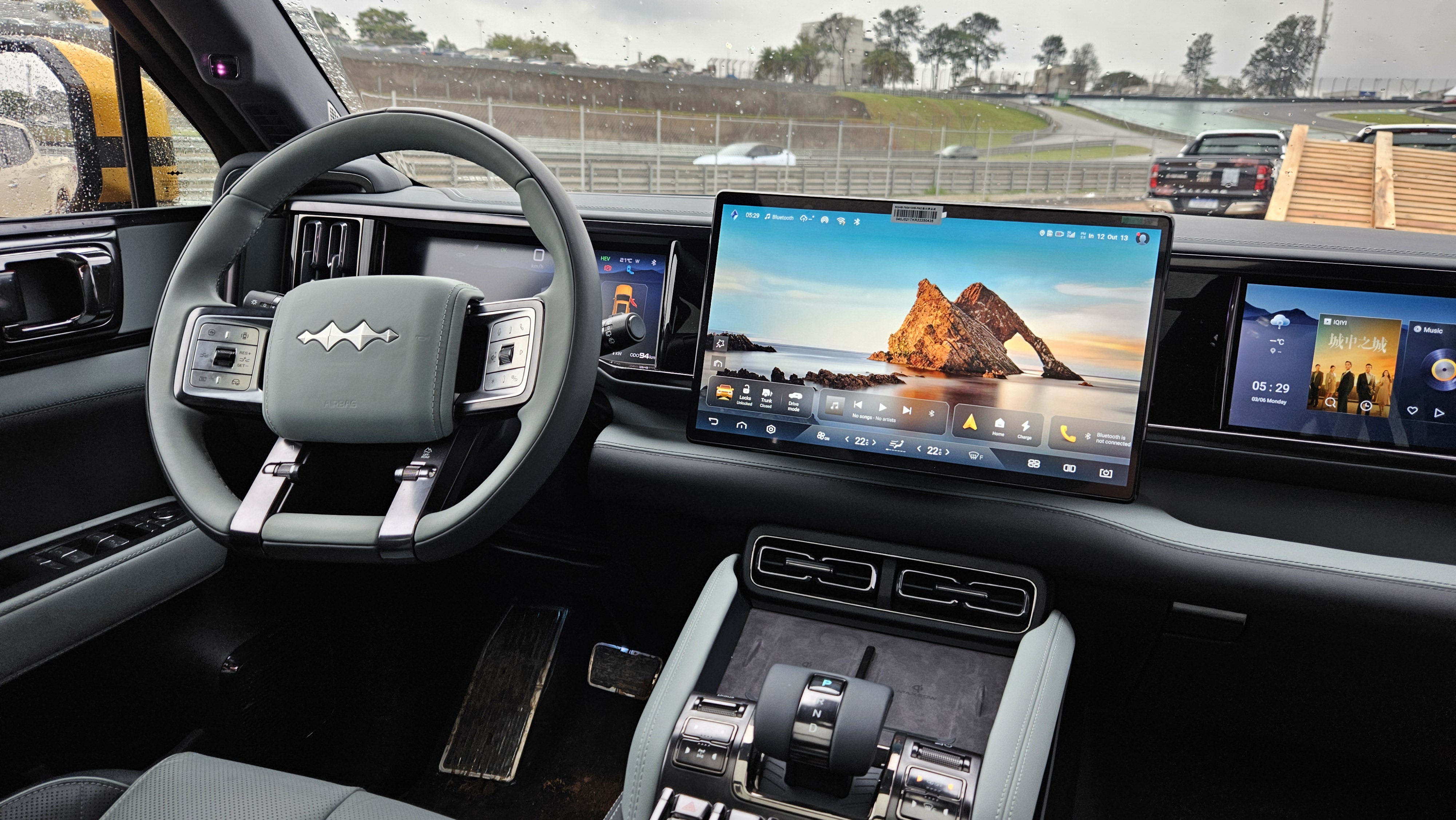O porte é similar ao de um Land Rover Defender, com quase 5 m de comprimento, 1,97 m de largura, 1,92 m de altura e 2,80 m de entre-eixos. O conjunto mecânico híbrido plug-in (DMO) usa um motor 1.5 turbo, mas entrega números superiores aos da picape: são 686 cv de potência combinada e 77,5 kgfm de torque.