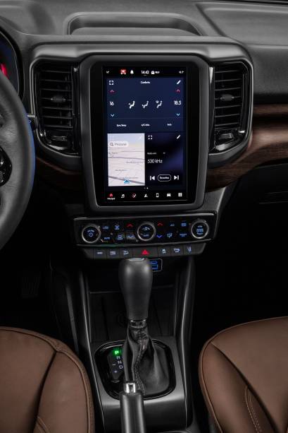 Nas versões mais caras, a central multimídia é de 10”, mas haverá opções de 8,4”e 7”. No caso da tela de 10,1”, a única mostrada na apresentação da picape, há recursos como GPS integrado com informações de trânsito e trajeto atualizado em tempo real.