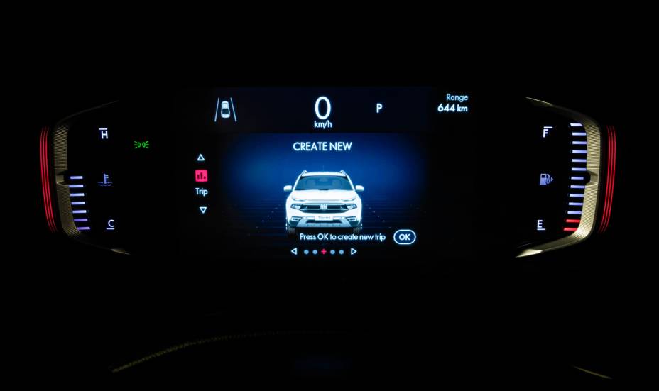 No painel de instrumentos, os mostradores foram substituídos por uma tela colorida de 7” em todas as versões. Essa tela pode ser configurada e tem cinco opções de grafismo. A Fiat Toro já tinha uma tela de 7″ antes, mas combinada com velocímetro e conta-giros analógicos.