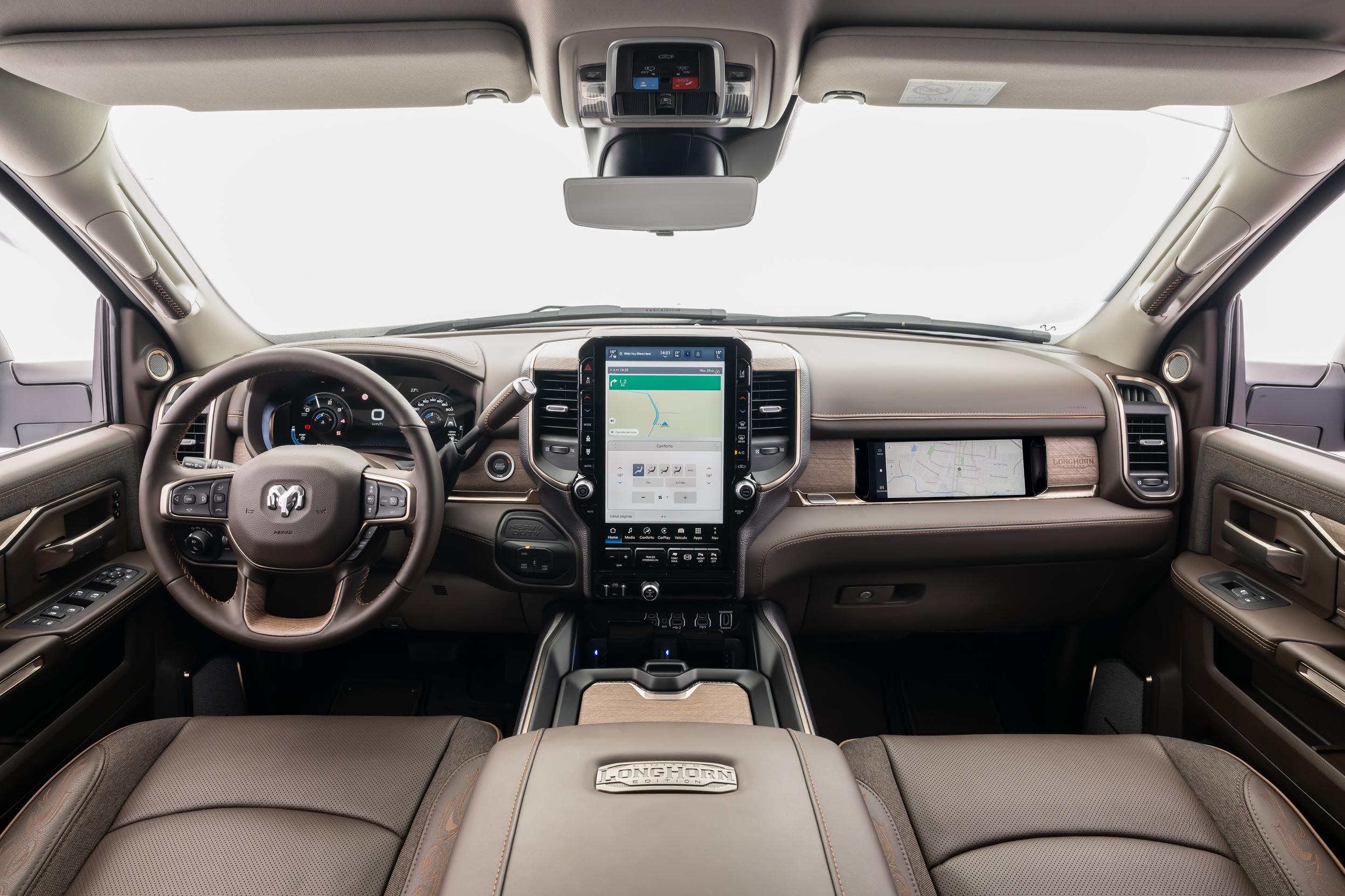Por dentro, as Ram 2500 Laramie têm acabamento marrom e bege, enquanto as 3500 Longhorn têm interior de couro marrom com pequenas partes de tecido e com filigranas com estilo country e até fivelas metálicas decorando os bolsos atrás dos bancos dianteiros.