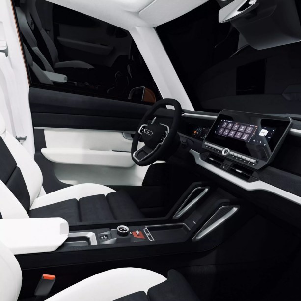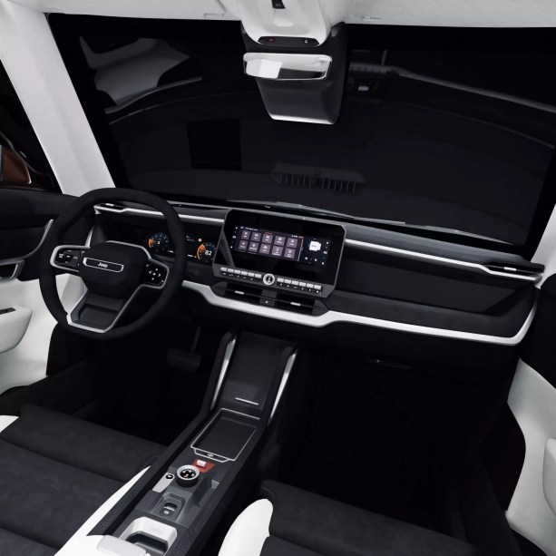 O console central é bem limpo. Nele podemos ver um nicho para celular — possivelmente tendo um carregador por indução — e um seletor de marchas giratórios. Há também o que se assemelha a um compartimento com porta, mas não dá para ter certeza. Já o volante tem três raios e aparenta ser revestido com material de toque macio, assim como boa parte da cabine.