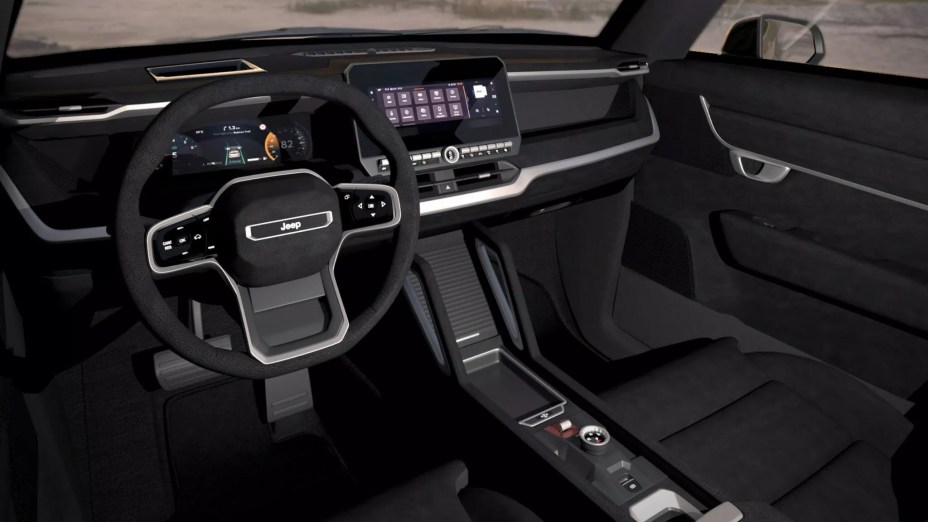 Maltese não parou na carroceria e também imaginou a cabine do novo Renegade. Há um grande quadro de instrumentos e, ao seu lado, uma central multimídia horizontal com tela flutuante. Mais embaixo ficam duas fileiras de botões físicos, que controlam algumas funções do carro, separadas por um dial.