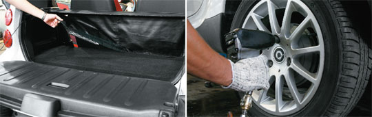 Porta-malas é minúsculo, mas a cobertura removível garante certa versatilidade (esq.). Na reta final, um pit-stop para troca dos pneus traseiros, que já assustavam na água (dir.).