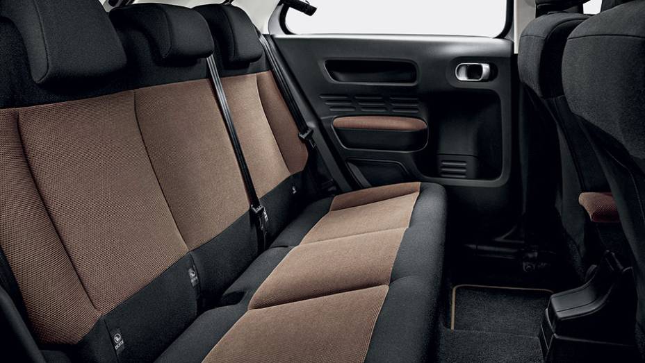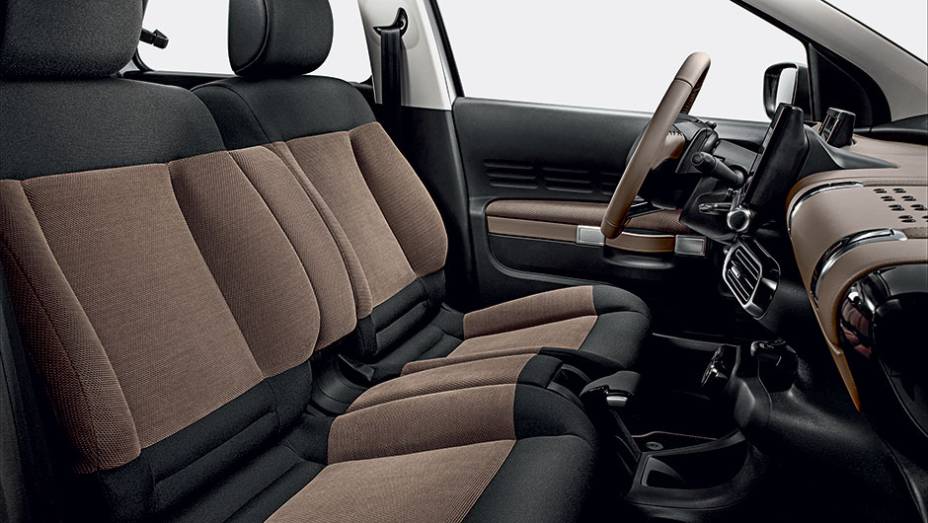 emborrachadas incorporadas às laterais e aos para-choques, que protegem a pintura dos pequenos toques e arranhões do dia a dia do trânsito. Eles ainda são personalizáveis em quatro cores (preto, cinza, areia e chocolate). Outro recurso original é o banco dianteiro interiço (comum nos carros dos anos 60 e 70), além da remoção da maioria dos botões de controle da cabine, que foram para a tela sensível ao toque de 7 polegadas, onde estão também a climatização e a central multimídia. À frente do motorista, um segundo monitor desempenha as funções de quadro de instrumentos.