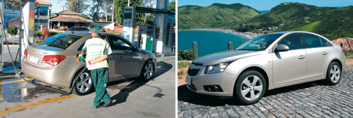 A rodagem com etanol obriga a paradas para reabastecimento mais constantes (esq.) | Nas mãos de um jornalista argentino, o Cruze visitou as praias do Rio, como a de Búzios (dir.)