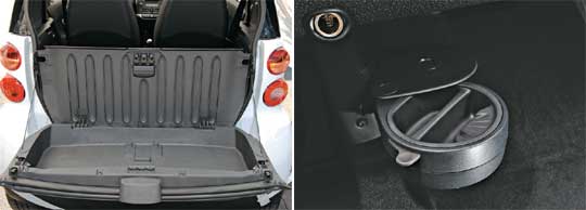 Porta-trecos na tampa do porta-malas: objetos soltos nele sempre foram sinônimo de barulho (esq.). Porta-objetos ineficiente: raso, instável, pequeno e mal localizado. Que falta faz um console central (dir.).