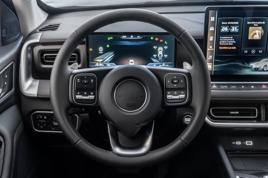 Quem exige um contato mais aprofundado para surpreender é o motor 2.4 turbodiesel de 184 cv e 48,9 kgfm disponível já a 1.500 rpm. A potência não chama a atenção, mas o torque está próximo daquilo que as rivais com mais de 200 cv entregam. O câmbio é sempre automático de nove marchas, produzido pela própria GWM, e a tração é 4×4 com as opções 2H, 4H e 4L, além de bloqueio do diferencial traseiro de série.