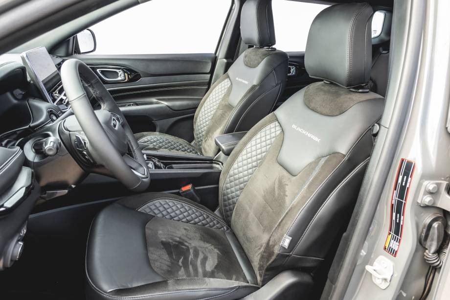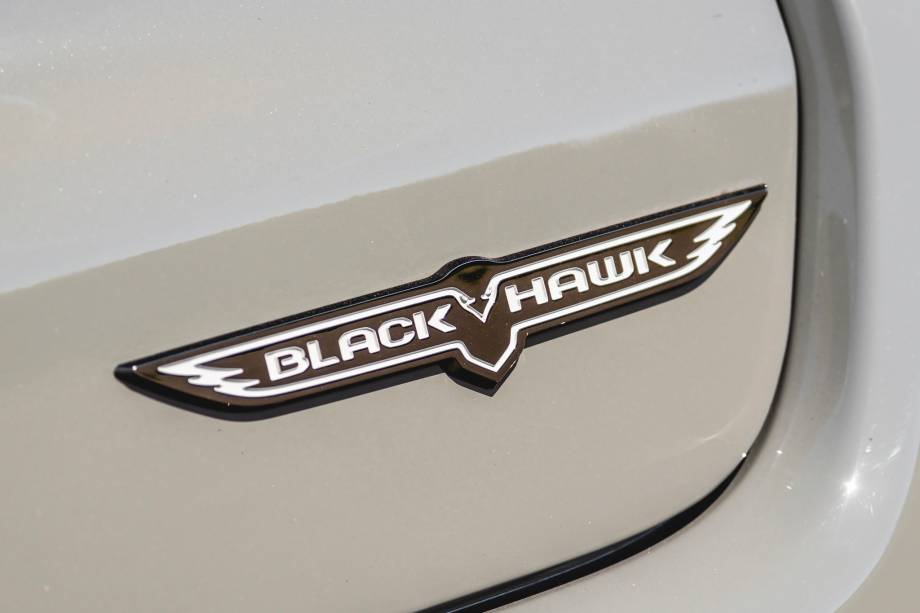 Nessa toada é possível notar os incrementos da versão Blackhawk, caso do ajuste elétrico para o banco do carona, além do ajuste elétrico para o assento do motorista, o acabamento em couro preto com partes de suede e costura em losângos e o nome da versão bordado em branco.