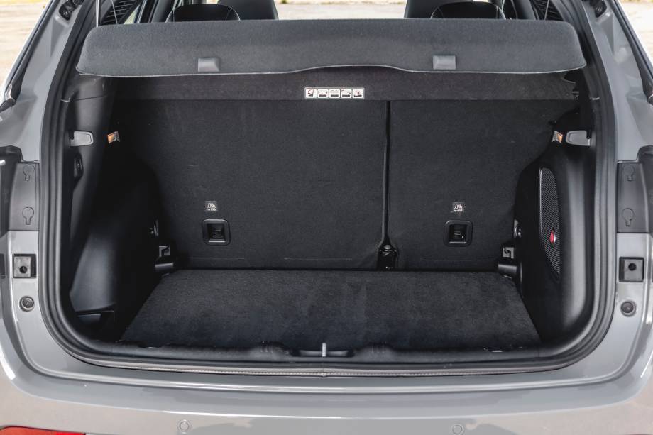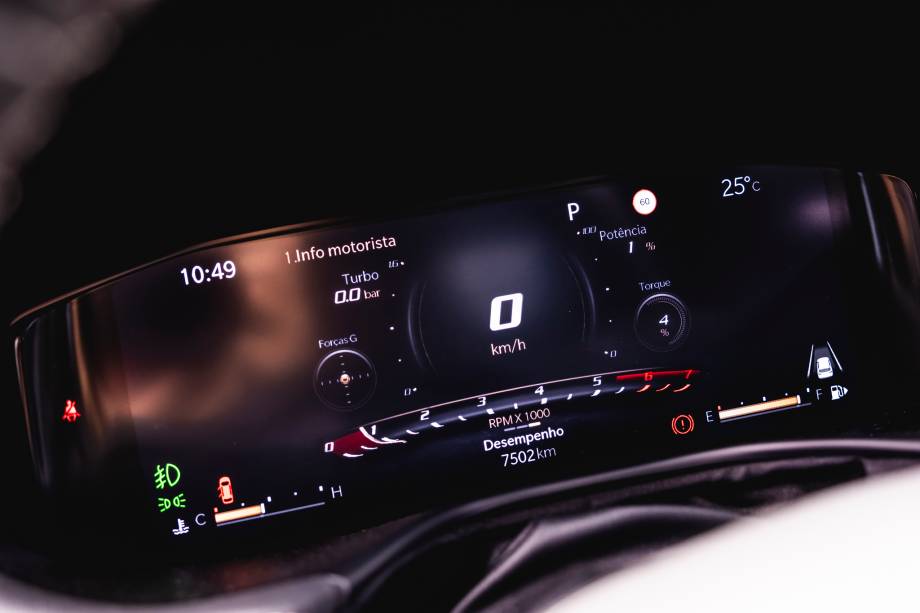 O quadro de instrumentos digital de 10,25” ainda tem as Performance Pages: modos de visualização em que dá ênfase aos elementos esportivos, como acelerômetro, pressão do turbo e uso de potência e torque do motor instantâneos. O porta-malas ainda tem abertura elétrica.