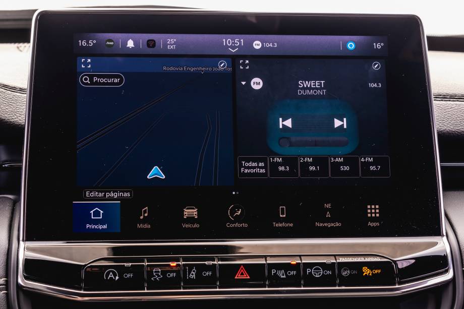 As retomadas fortes têm suas sensações ampliadas pela tração nas quatro rodas e pela forma como gruda no asfalto. Mas o motorista não terá problemas para dirigir tranquilamente, porque o motor 2.0 turbo “sobra” tanto que pode trabalhar manso, nas baixas rotações que o câmbio de nove marchas permite. E tem mais: as respostas do acelerador são rápidas, ao contrário do que acontece com os outros motores do Compass.