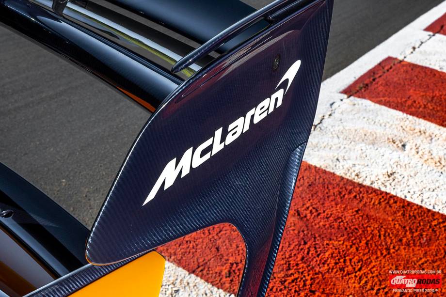 Do enorme aerofólio traseiro (a primeira peça revelada na chegada) até os defletores de ar dianteiros, passando pela fibra de carbono azul exposta onde a carroceria não é pintada, tudo impressiona.