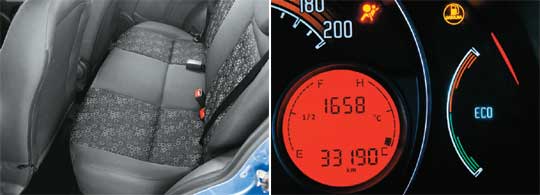 Com os bancos dianteiros recuados, o espaço para quem viaja atrás se reduz drasticamente (esq.); Luz-espia indica quando o nível de gasolina do reservatório de partida a frio está baixo (dir.).