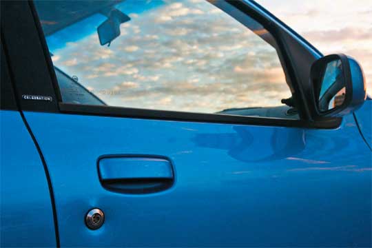 Menos de 5 minutos. Esse foi o período que o Uno ficou estacionado num bairro residencial e aparentemente tranqüilo de São Paulo até sofrer uma tentativa de arrombamento. Por um lado, tivemos a sorte de que o tempo não foi suficiente para a entrada efetiva do gatuno. Por outro, a ação apressada deixou marcas na porta dianteira direita. Além do miolo da fechadura arrombado, a lataria foi amassada, chegando a trincar a pintura.