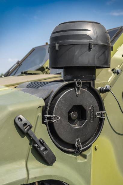 Mas o que realmente surpreende são as funções e equipamentos incomuns. Sendo um veículo tático, passar despercebido pelo inimigo é fundamental. Um botão à esquerda do volante é o blackout: desliga todas as luzes do veículo, enquanto um conjunto com seis baterias extras (além das duas usadas para o sistema de 24 V, como o de um caminhão) garante o funcionamento de todos os sistemas vitais por horas a fio com o motor desligado.