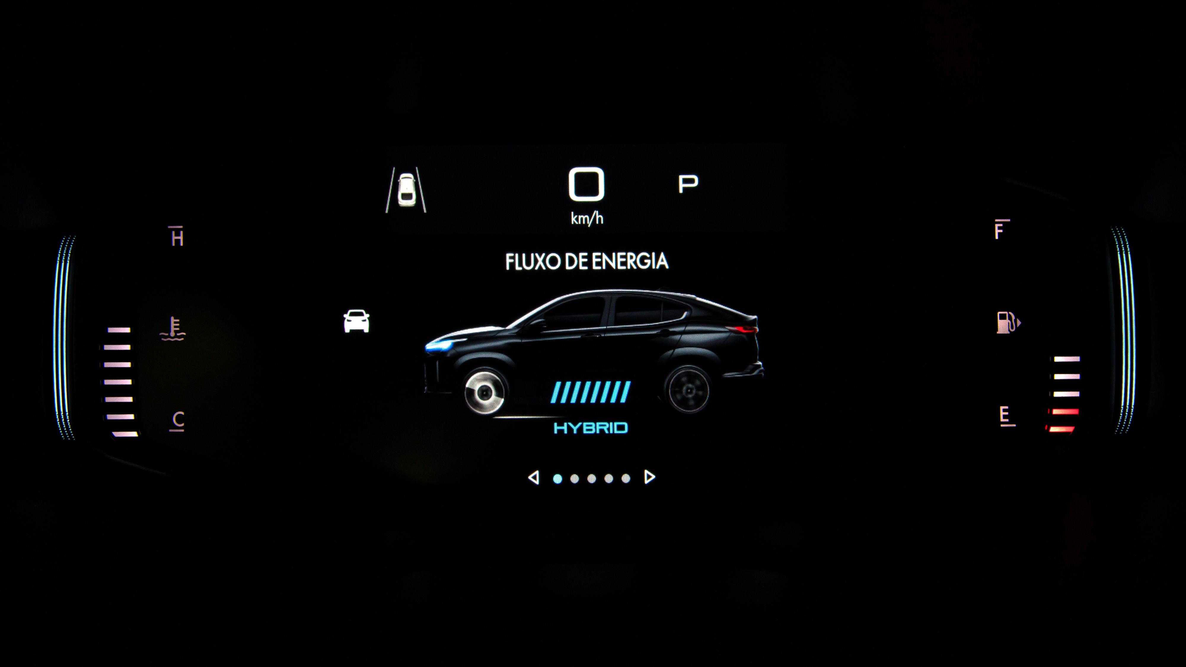 O quadro de instrumentos ajuda a acompanhar essa assistência elétrica. Há três formas de acompanhar a atuação do motor elétrico, a regeneração e a carga da bateria: ou por um monitor com o carro estilizado, pelo econômetro em destaque e pela tela que une essas informações ao modo que também exibe velocímetro e conta-giros. O movimento azul indica o impulso elétrico e o verde, a regeneração.