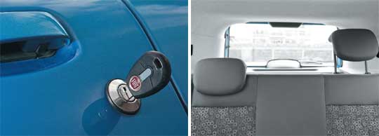 Uno tem ABS e airbag, mas falta um simples controle remoto para ativar travas e alarme (esq.). Fora de uso, os apoio de cabeça tipo vírgula não atrapalham a visibilidade do motorista (dir.).
