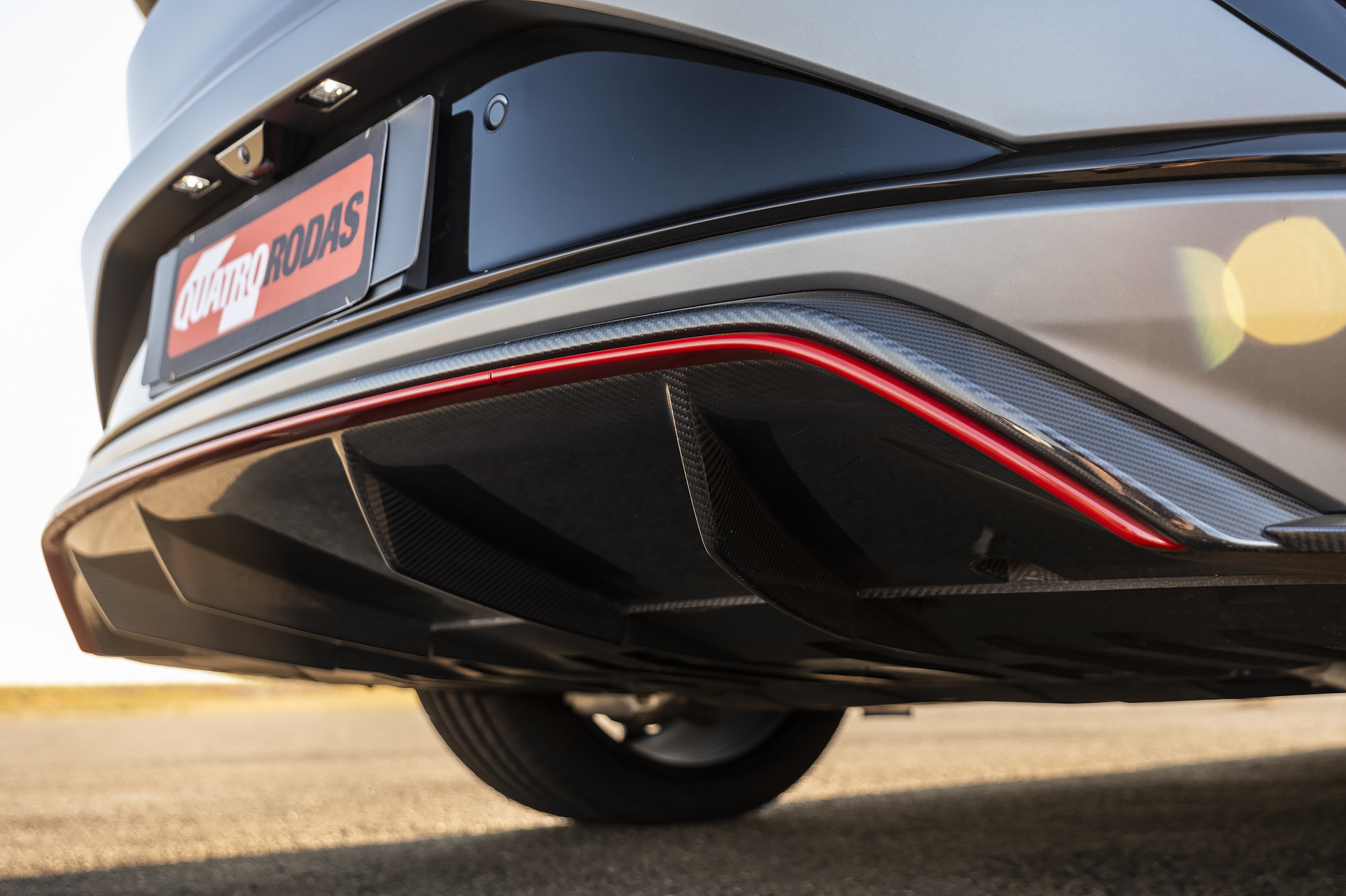 É uma exclusividade discreta, porque os elementos aerodinâmicos de fibra de carbono, que aparecem nos para-choques, retrovisores e saias laterais, além de estar em todo o teto (é a única versão sem teto de vidro) não se destacam tanto quanto a enorme asa traseira. Por outro lado, o vermelho sangue predomina na cabine, muito sem sentido.